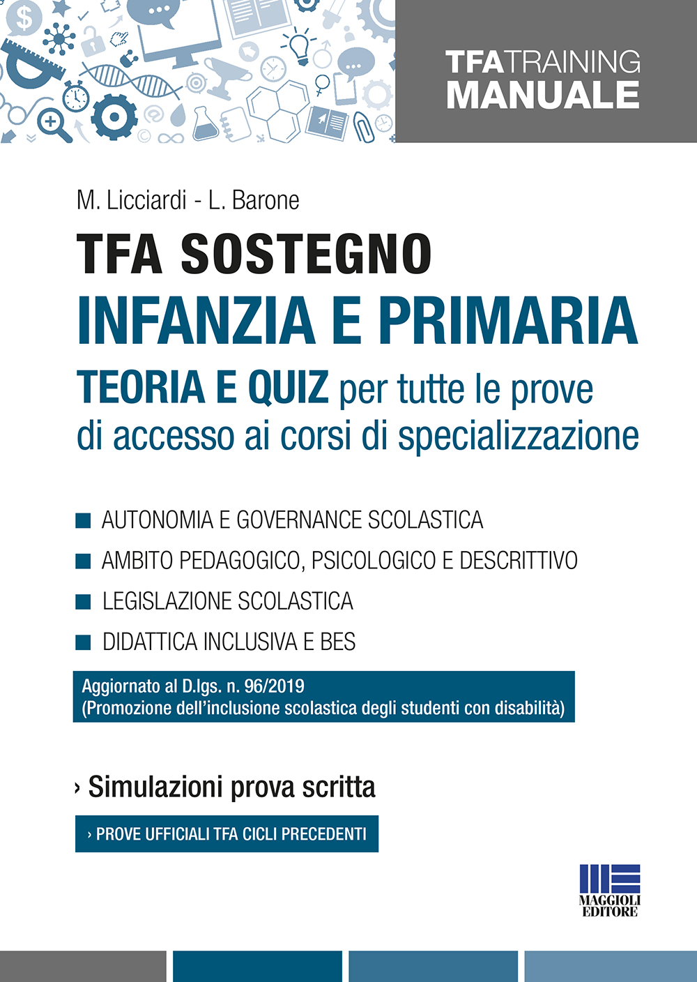 Il volume è indirizzato a quanti intendono accedere al V ciclo del Tirocinio Formativo Attivo dedicato al sostegno didattico, come previsto dal Decreto MIUR del 12 febbraio 2020, n. 95.Le prove di accesso ai corsi del TFA sostegno sono:- prova preliminare: test di 60 quesiti formulati con cinque opzioni di risposta, di cui almeno 20 quiz sono volti a verificare le competenze linguistiche e la comprensione dei testi in lingua italiana;- una o più prove scritte;- prova orale.Questo volume contiene le prove ufficiali assegnate nei test di accesso ai primi 4 cicli di TFA sostegno svolti in molte università italiane dedicati a:- scuola dell’infanzia;- scuola primaria;- scuola secondaria di primo grado;- scuola secondaria di secondo grado.Il testo è uno strumento di grande utilità per i candidati in quanto fornisce informazioni sullo svolgimento dei test preselettivi con un ampio ventaglio di prove assegnate nei primi 4 cicli del Tirocinio Formativo Attivo dedicato al sostegno didattico e una raccolta delle tracce ufficiali assegnate in alcune prove scritte.Disponibili nella sezione online su https://www.maggiolieditore.it, raggiungibile tramite il codice riportato in fondo al volume, ulteriori esempi di prove ufficiali e nuove videolezioni di Giuseppe Cotruvo su come affrontare le prove, con alcune tecniche di risoluzione dei quiz di competenze linguistiche e logica deduttiva.In sintesi, questo volume rappresenta una “palestra di allenamento” per aiutare i candidati ad affrontare più serenamente, con maggiore consapevolezza e con irrobustite chance di vittoria le prove concorsuali per l’accesso ai corsi inerenti il sostegno.