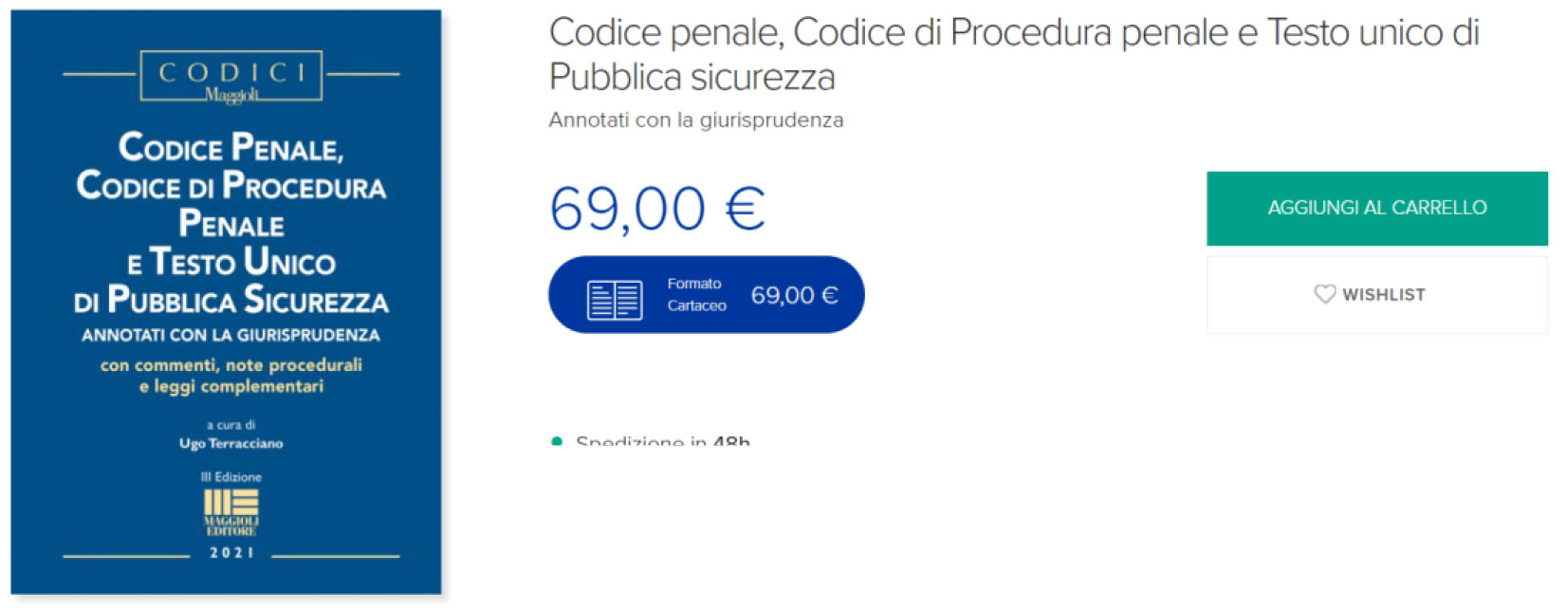 Consigliamo il “Codice penale, Codice di Procedura penale e Testo unico di Pubblica sicurezza” edito da Maggioli Editore.
