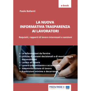 La nuova informativa trasparenza ai lavoratori (eBook)La nuova informativa trasparenza ai lavoratori: Requisiti, rapporti di lavoro interessati e sanzioni; eBook in pdf di 84 pagine 16,90 € + 4% IVA |
