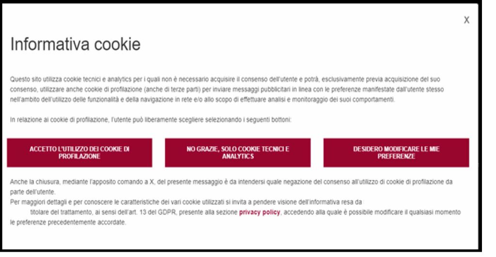 Deve essere previsto il pulsante di chiusura del banner (una X in alto a destra, generalmente) che se azionato chiude il banner mantenendo le impostazioni di default, quindi non installando alcun cookie di profilazione. Tale comando deve essere graficamente evidente e, per evitare di influenzare l’interessato, sia il comando di chiusura sia gli ulteriori comandi (consenso all’installazione di tutti i cookie o rinvio ad una pagina di espressione delle preferenze relative) dovrebbero avere uguali colori, uguali dimensioni e rilevanza grafica.
