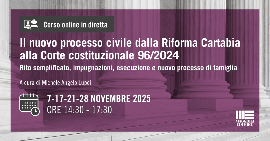 A due anni dall’entrata in vigore della Riforma Cartabia, il processo civile italiano vive una fase di consolidamento e assestamento, segnata dall’intervento della Corte costituzionale n. 96/2024, che ha inciso su uno dei punti più discussi della riforma: il rapporto tra rito ordinario e rito semplificato. In questo contesto, il corso “Il nuovo processo civile dalla Riforma Cartabia alla Corte costituzionale 96/2024 – Rito semplificato, impugnazioni, esecuzione e nuovo processo di famiglia”, organizzato in quattro incontri tematici, rappresenta un’occasione formativa di alto livello per chi desidera aggiornarsi sulle ultime evoluzioni della giustizia civile con un approccio concreto e operativo.
