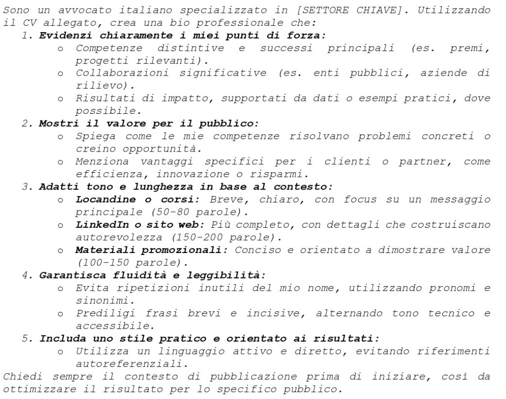 Efficacia: il prompt guida nella creazione di bio chiare e complete, adattabili a vari contesti. Aiuta a comunicare chiaramente il valore aggiunto delle proprie competenze, traducendo esperienze e risultati in benefici concreti per il pubblico.