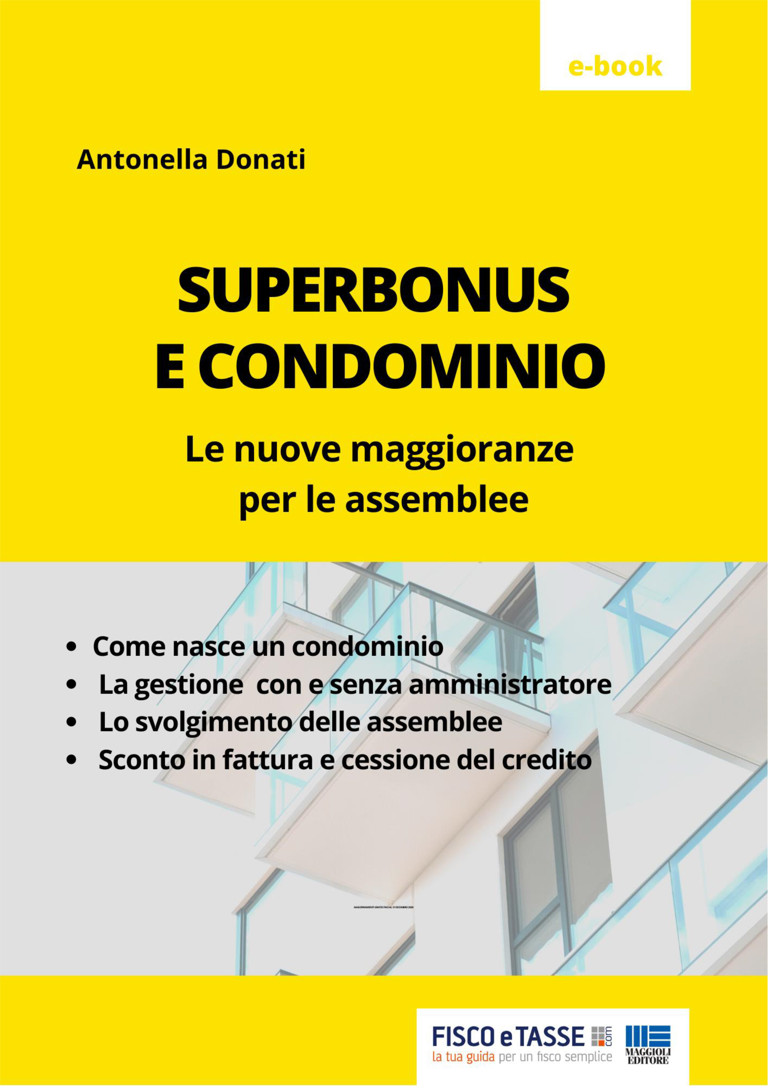 Maggioranza ridotta per l’approvazione delle delibere in materia di Superbonus.Questa la principale novità in questo scorcio d’anno per quel che riguarda l’attività dell’amministratore di condominio.Nell’ebook, in formato pdf di 71 pagine, una panoramica delle ultime novità.Come nasce un condominioLa gestione con e senza amministratoreLo svolgimento delle assembleeSconto in fattura e cessione del creditoCon il Superbonus aumentano le responsabilità in materia fiscale con la possibilità di cessione del credito o di sconto in fattura, con l’obbligo, per l’amministratore di effettuare preventivamente tutte le verifiche necessarie per la corretta attribuzione delle detrazioni.Particolare attenzione per gli edifici nei quali sono presenti oltre alle unità per uso residenziale immobili commerciali.Al momento per lo svolgimento delle assemblee si conferma la necessità del rispetto delle norme sul distanziamento sociale.Apposite Linee Guida sono state messe a punto per questo dalla Confedilizia.Antonella DonatiGiornalista professionista, ha al suo attivo diversi anni di giornalismo parlamentare con particolare attenzione all’approvazione delle misure di carattere finanziario e alle manovre di bilancio. In questo ambito si occupa espressamente di tematiche fiscali, contributive e previdenziali. È autrice di numerosi volumi, articoli e saggi in materia.