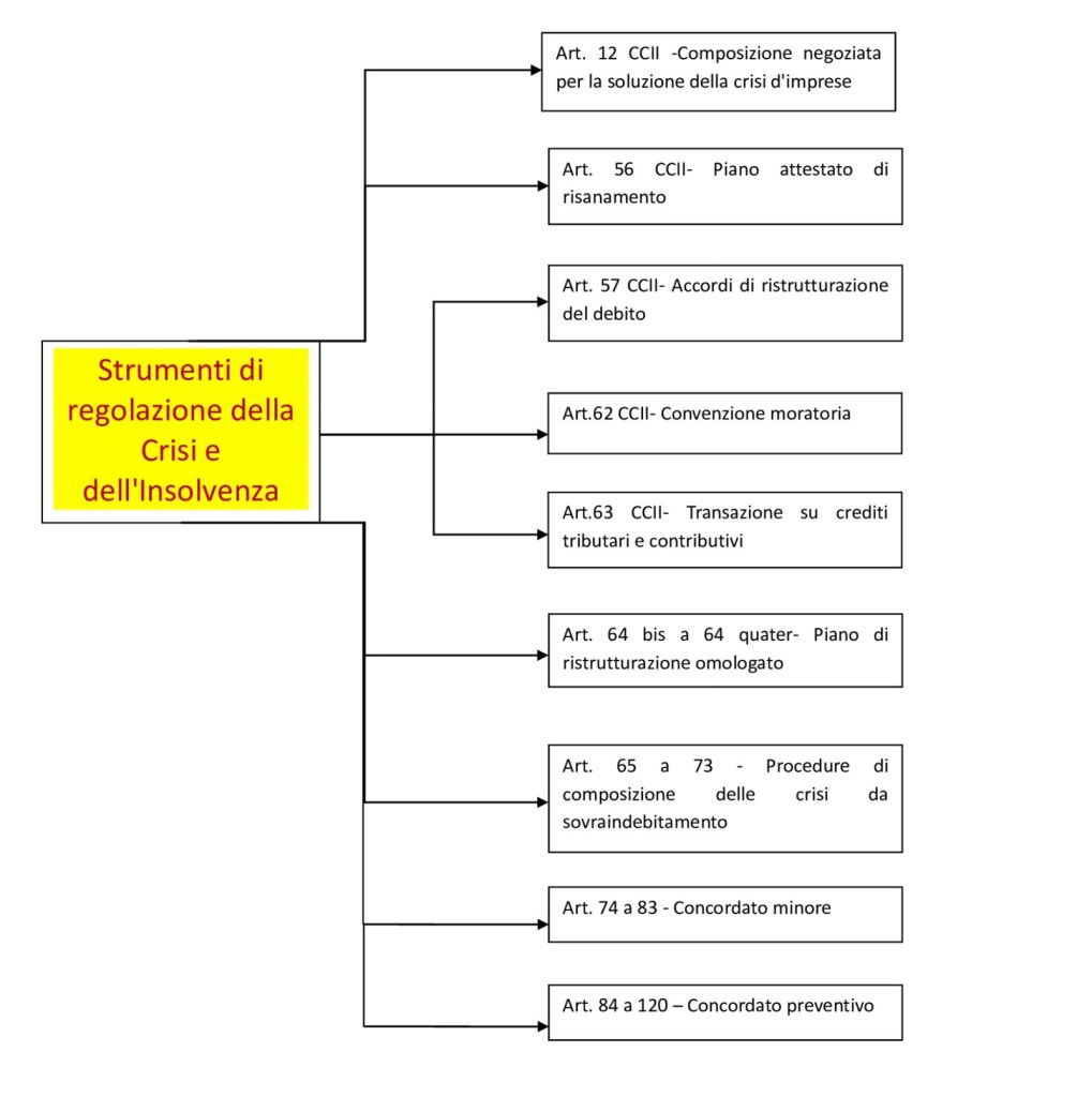 Di seguito si riporta una tavola sinottica degli strumenti di regolazione della crisi e dell’insolvenza al fine di agevolare la consultazione del CCII e l’individuazione della procedura ritenuta più idonea al caso concreto.