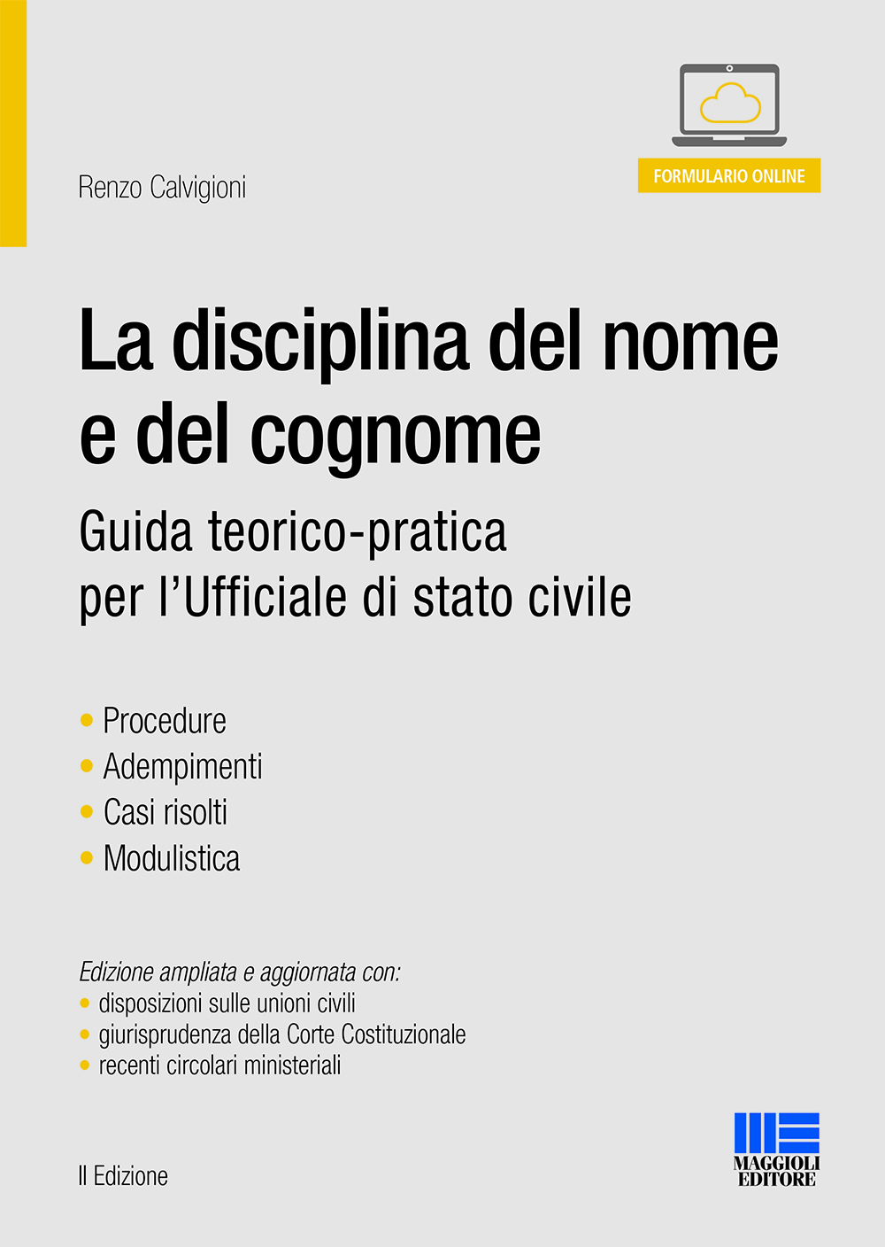 Il nome e il cognome, da sempre, una delle tematiche che l’ufficiale deve affrontare con maggiore frequenza nello svolgimento del proprio lavoro. A iniziare dalla formazione di nascita, per continuare con le atti vicende successive di eventuali riconoscimenti o adozione, di modifica delle proprie generalità, ma anche al momento della celebrazione del matrimonio o della costituzione di unione civile, delle mutazioni in materia di cittadinanza, alla redazione dell’atto di morte, il nome e il cognome rappresentano gli elementi costanti della vita dell’individuo, tanto che eventuali discordanze debbono essere risolte tempestivamente per evitare disagi al cittadino o inadempienze della pubblica amministrazione.Lo scopo è quello di fornire uno strumento di reale supporto all’operato dell’ufficiale dello stato civile, che gli accordi di affrontare le diverse problematiche che lo coinvolgere, così da metterlo in condizioni di dare adeguate risposte alle istanze dei cittadini per le quali è richiesto un livello di professionalità sempre crescente poiché il rispetto delle disposizioni vigenti e la correttezza delle procedure richieste imprescindibili per garantire la funzionalità dell’ufficio di stato civile. Renzo Calvigioni Già responsabile Servizi Demografici, esperto e docente Anusca, Direttore della rivista “I Servizi Demografici”. L’acquisto del volume include la modulistica in versione compilabile: 40 modelli per lo svolgimento di tutte le procedure e adempimenti relativi alla disciplina del nome e del cognome, disponibile all’indirizzo www.approfondimenti.maggioli.it . All’interno del volume sono presenti le istruzioni per accedere all’area riservata del sito.