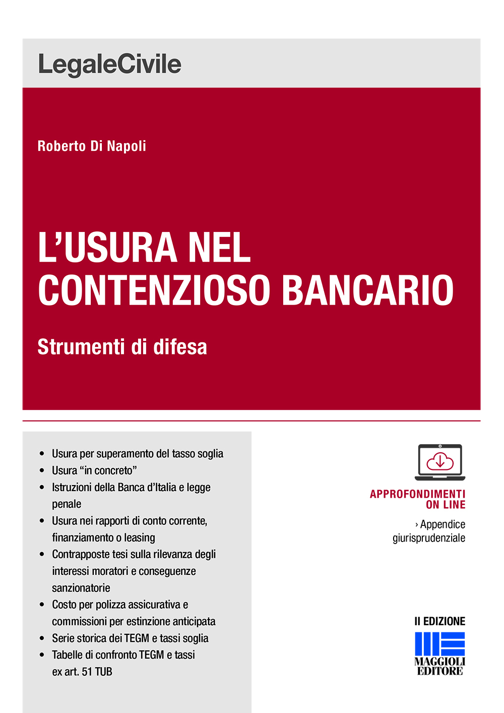 La seconda edizione della presente opera ha un accentuato taglio operativo ed è aggiornata alla più recente giurisprudenza. Il testo, oltre ad un’analisi delle principali pronunce e delle contrapposte tesi, offre spunti di riflessione al fine di verificare la compatibilità di alcuni argomenti difensivi con la normativa vigente.Ai fini di una più agevole comprensione delle problematiche in oggetto, si affrontano anche i seguenti temi:-la determinazione del tasso effettivo globale;-l’usura nei rapporti di apertura di credito in conto corrente;-l’usura nei contratti di mutuo e nella locazione finanziaria (leasing);-le principali argomentazioni a sostegno dell’esclusione degli interessi moratori ai fini della verifica di usurarietà (tesi frequentemente utilizzate dalle banche) o in merito alle conseguenze sanzionatorie;-le principali argomentazioni a sostegno della rilevanza degli interessi moratori ai fini della verifica dell’usura rietà e della non debenza di interessi;-i costi per polizze assicurative o per estinzione anticipata;-riflessioni in merito alle diverse formule divulgate dalla Banca d’Italia a fini statistici o ai fini della rilevazione dei tassi medi ai sensi della normativa antiusura.Nel testo sono riportate le serie storiche del tasso effettivo globale medio e della commissione di massimo scoperto, oltre a delle utili tabelle di raffronto tra il TEGM e i tassi ex art. 51 TUB.Il volume è completato da una ricca appendice giurisprudenziale, cui si accede collegandosi alla pagina www.approfondimenti.maggioli.it e servendosi del codice presente alla fine del testo.Roberto Di NapoliAvvocato in Roma, abilitato al patrocinio dinanzi alla Corte di Cassazione. Esercita la professione forense prevalentemente in controversie a tutela degli utenti bancari e del consumatore. Collabora con varie associazioni anti-usura. Docente in corsi di formazione e autore di articoli di commento su riviste giuridiche telematiche.